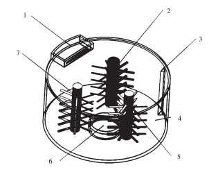 1.進料口 2.主槳 3.壁部刮刀 4.料倉 5.第二副槳 6.出料口 7.副槳