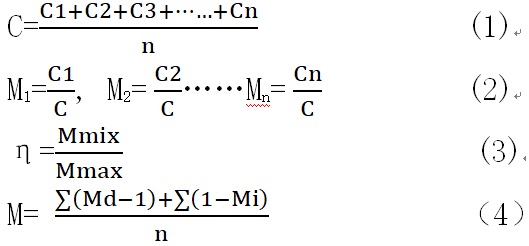 衡量混合作業(yè)的質(zhì)量可用混合效率η和混合料的平均均勻系數(shù)m來(lái)計(jì)算,其計(jì)算公式如下: