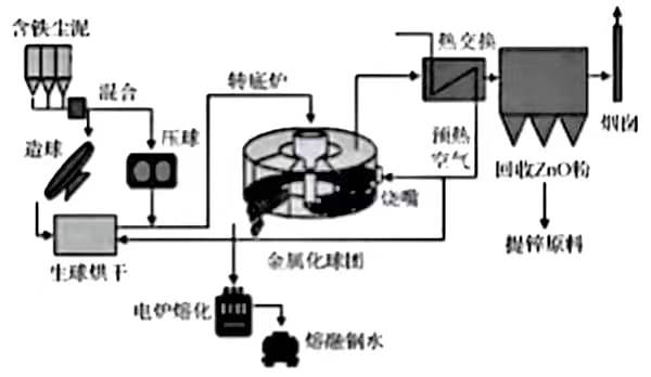 含鐵塵泥是鋼鐵生產(chǎn)過(guò)程中種類(lèi)較為繁多的廢棄物,其成分復(fù)雜,含有鐵、鈣、鎂、碳等鋼鐵生產(chǎn)所需的元素,是非常有價(jià)值的二次資源。轉(zhuǎn)底爐直接還原工藝通過(guò)造球和壓球的方式將各種除塵灰、污泥制成球團(tuán),經(jīng)過(guò)烘干、預(yù)熱、焙燒還原、冷卻等工序生產(chǎn)、金屬化球團(tuán),用于電爐作為造渣劑或替代廢鋼使用;塵泥中的鋅在高溫下被還原成單質(zhì)鋅,揮發(fā)進(jìn)入煙氣,煙氣經(jīng)冷卻、除塵后得到副產(chǎn)品氧化鋅粉,用于進(jìn)一步提鋅,處理效果顯著。
