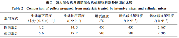 分別將圓筒混合機(jī)和強(qiáng)力混合機(jī)處理的鐵精礦用于造球、預(yù)熱和焙燒,其結(jié)果比較如下表所示: 在使用強(qiáng)力混合機(jī)進(jìn)行混合后,球團(tuán)的各項(xiàng)指標(biāo)均有不同程度的提高,尤其是生球強(qiáng)度,提高的效果十分顯著,主要原因是強(qiáng)力混合機(jī)使膨潤土在物料中分散得更加均勻,顆粒與顆粒之間黏結(jié)得更加緊密,從而提高了生球的落下強(qiáng)度和抗壓強(qiáng)度,預(yù)熱球及焙燒球抗壓強(qiáng)度分別提高 66、118 N/P。